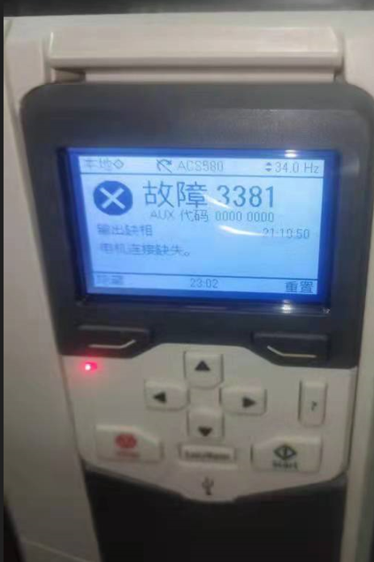 ACS580变频器故障报故障代码3381是输出缺相,需检查电机电缆,由于电机连接断开(所有三个相均未连接),电机电路故障。